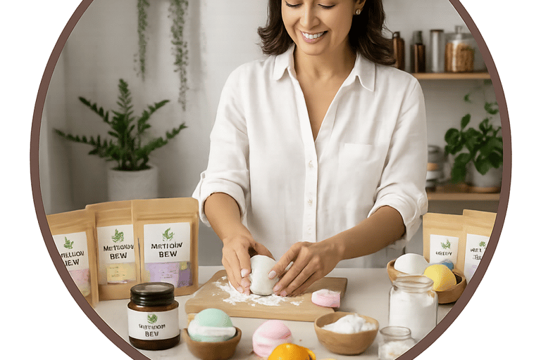 Recibirás un kit completo de formación que incluye recetas en tendencia de sales y bombas de baño terapéuticas, junto con el Método BEM™, un sistema paso a paso para crear, posicionar y vender tu propia línea de productos naturales con propósito.